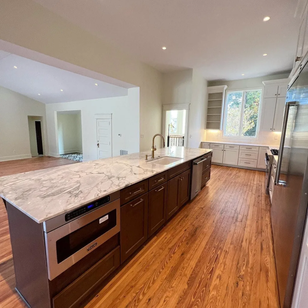 Historic Benton Renovation. Our residential team just recently wrapped up this interior and exterior full house renovation of this historic 8th Ave Melrose mansion. Built in 1910 and former home of “Nashvilles first resident” Timothy Demonbruen our team gave the entire 8,800 Sq Ft/1/2 acre lot luxury upgrades. Interior updates – 800 Sq Ft living room addition, 5 Bedrooms, 7 bathrooms, 2 laundry rooms, kitchen, wine cellar, office, basement/third floor bonus rooms, butlers pantry, mud room. Exterior upgrades – pool renovation, rooftop decks, fencing, landscaping, hardscape patios, pool gazebo