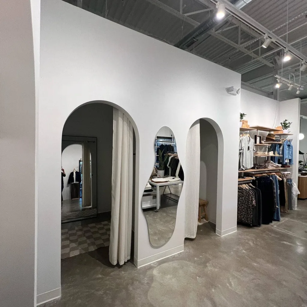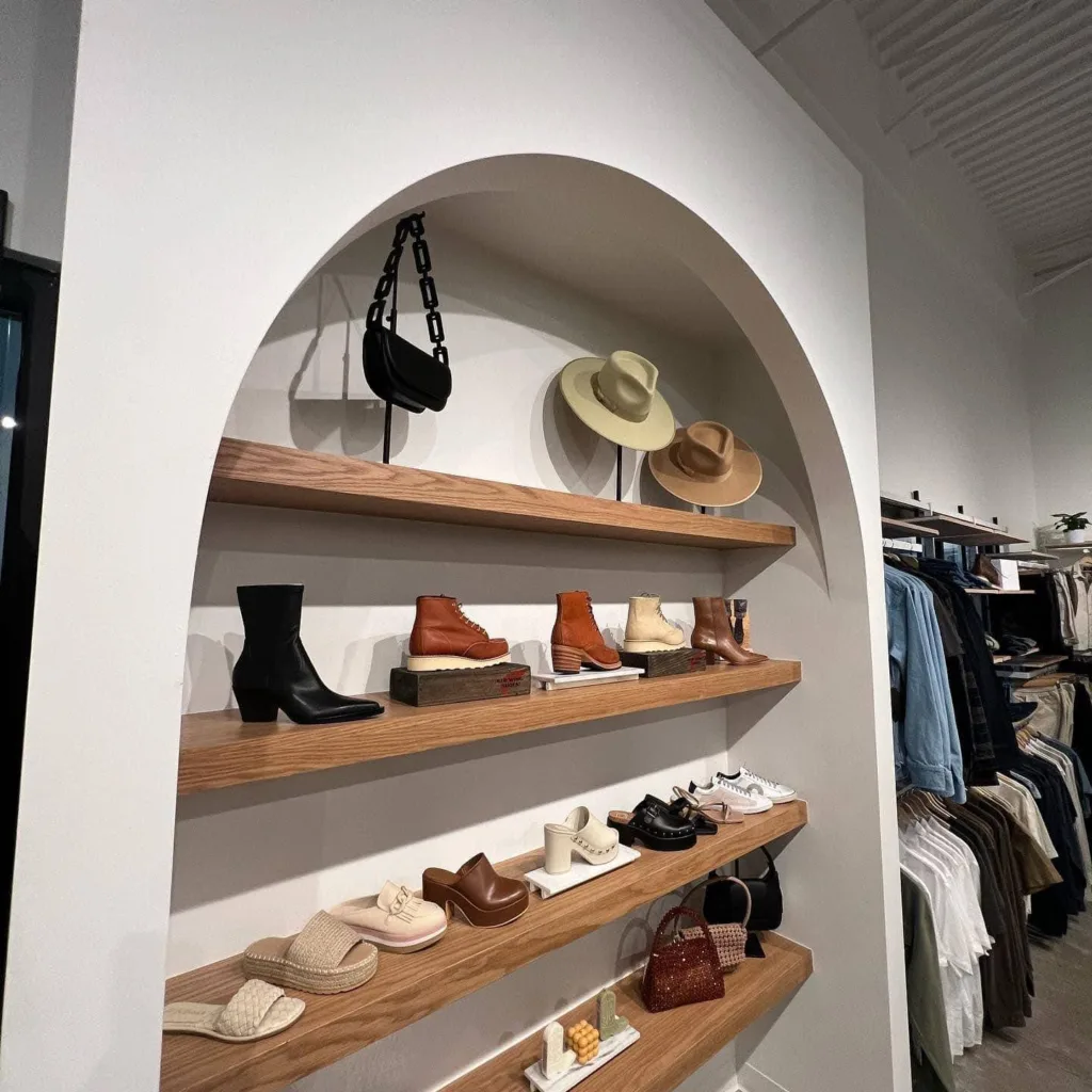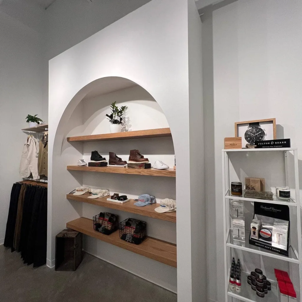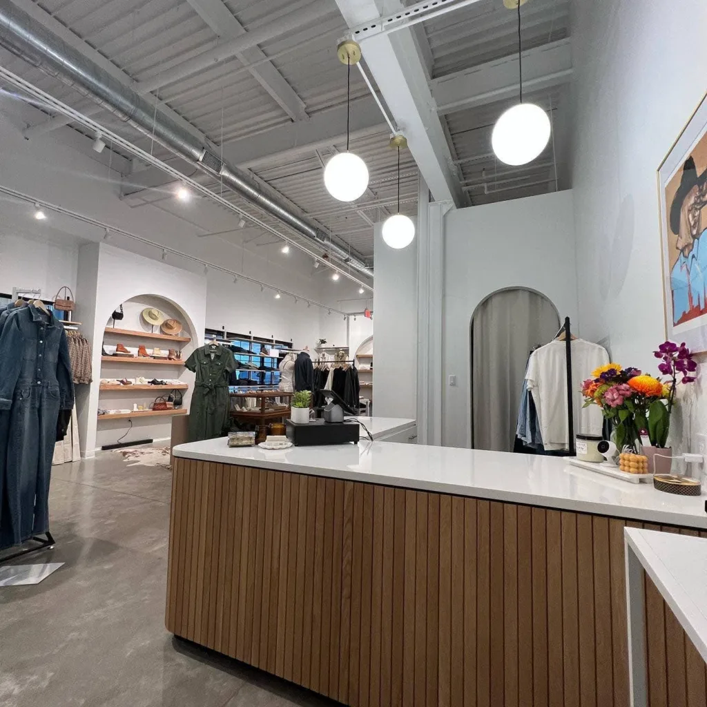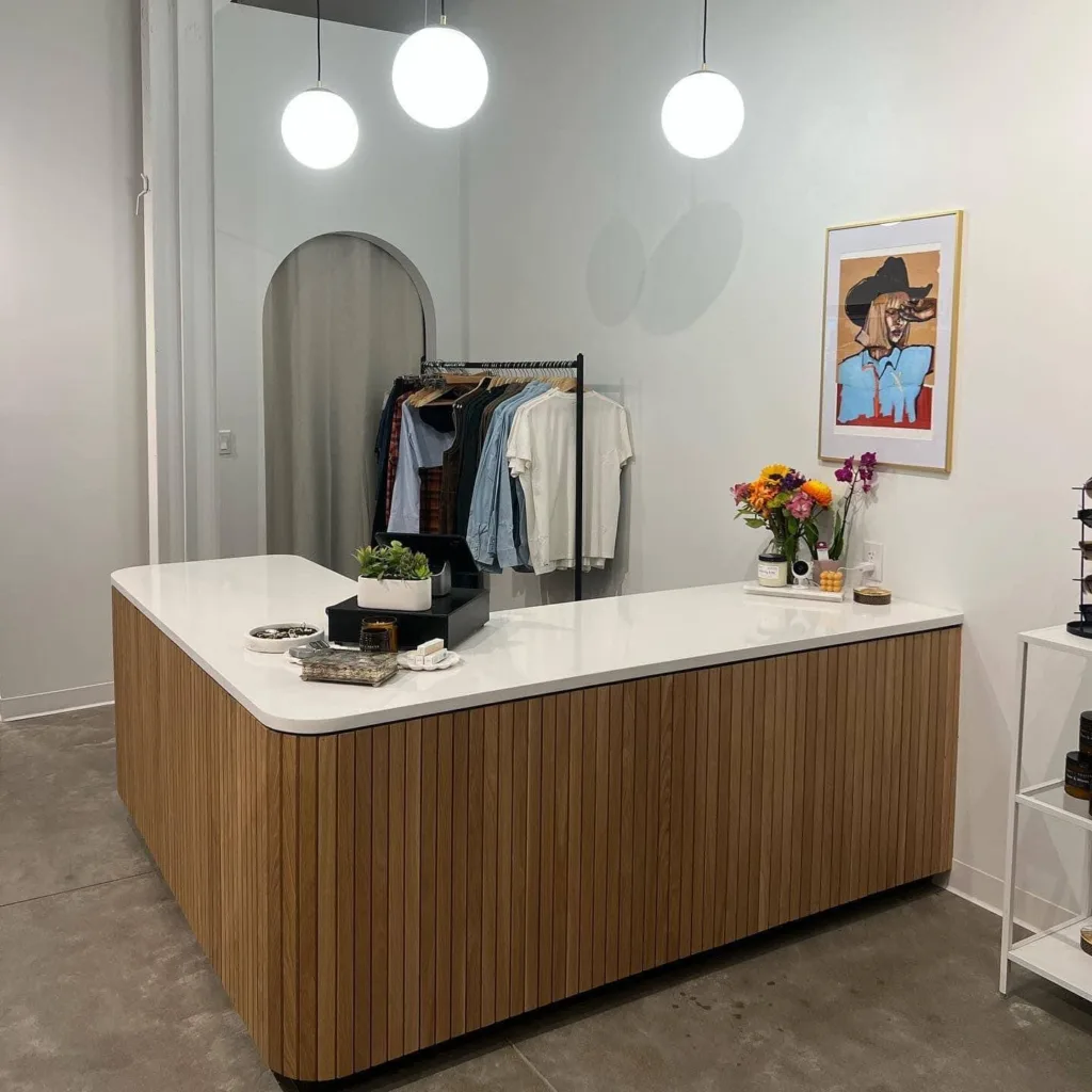 Our commercial build out division wrapped up this stylish clothing store build complete with a custom white oak/quartz cash wrap and white oak floating shelves recessed in arched openings.