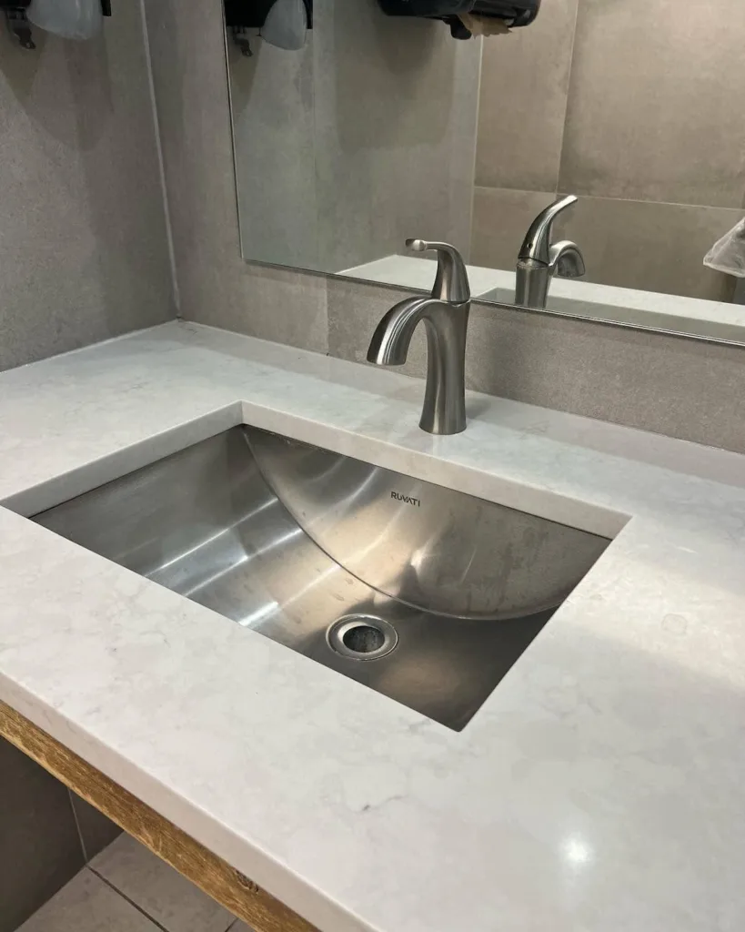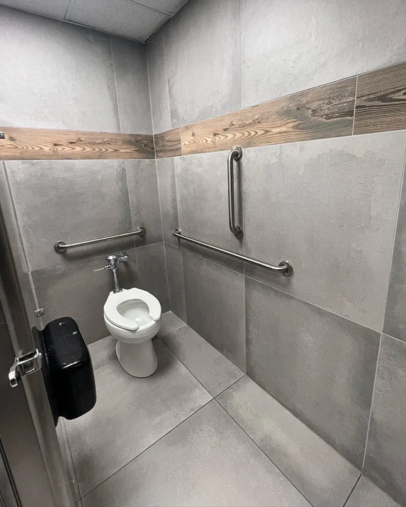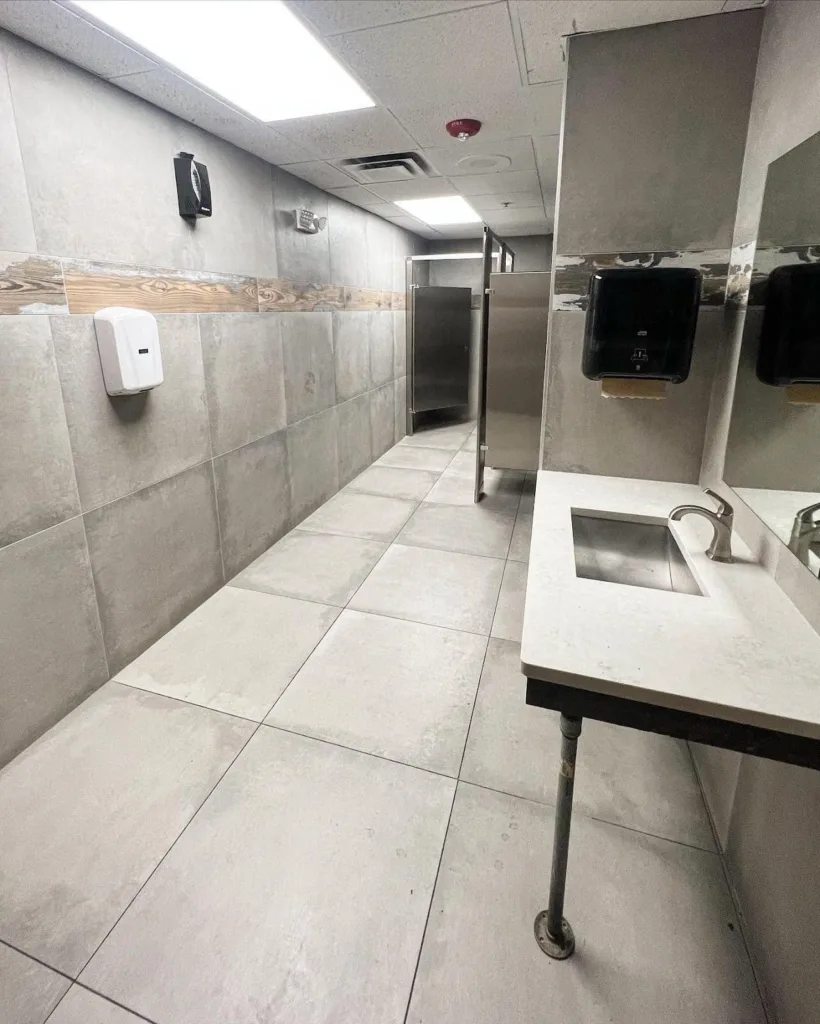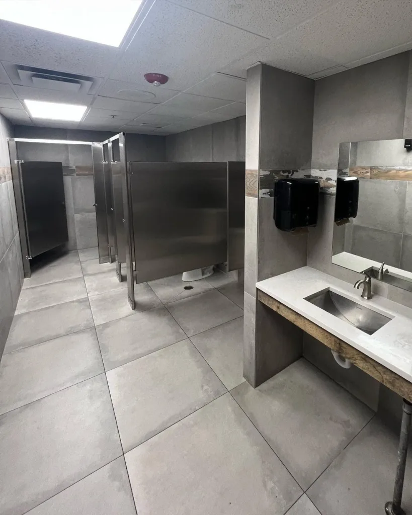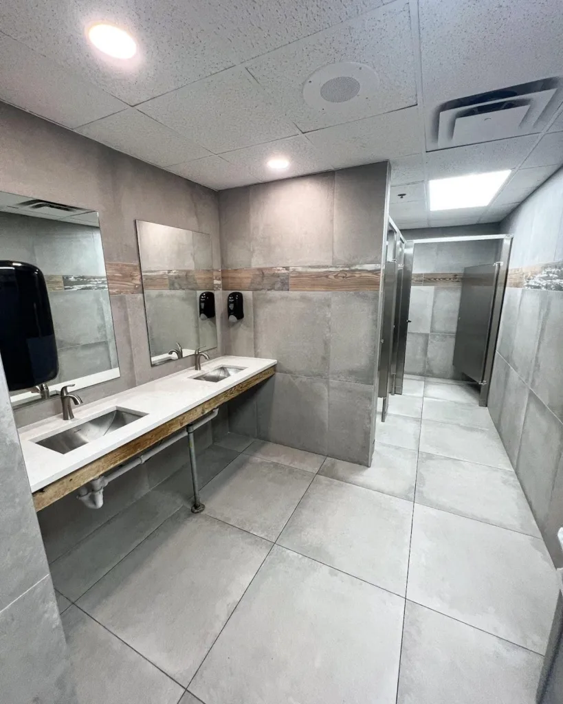 Bathroom Before and Afters at our recently completed Santa Fe Cattle Co. restaurant refresh. Five days and our crews had the men’s and women’s bathrooms completely transformed with new large format porcelain tiles, reclaimed wood look accent tile, new countertops, painting, lighting, new stainless partitions and fixtures.