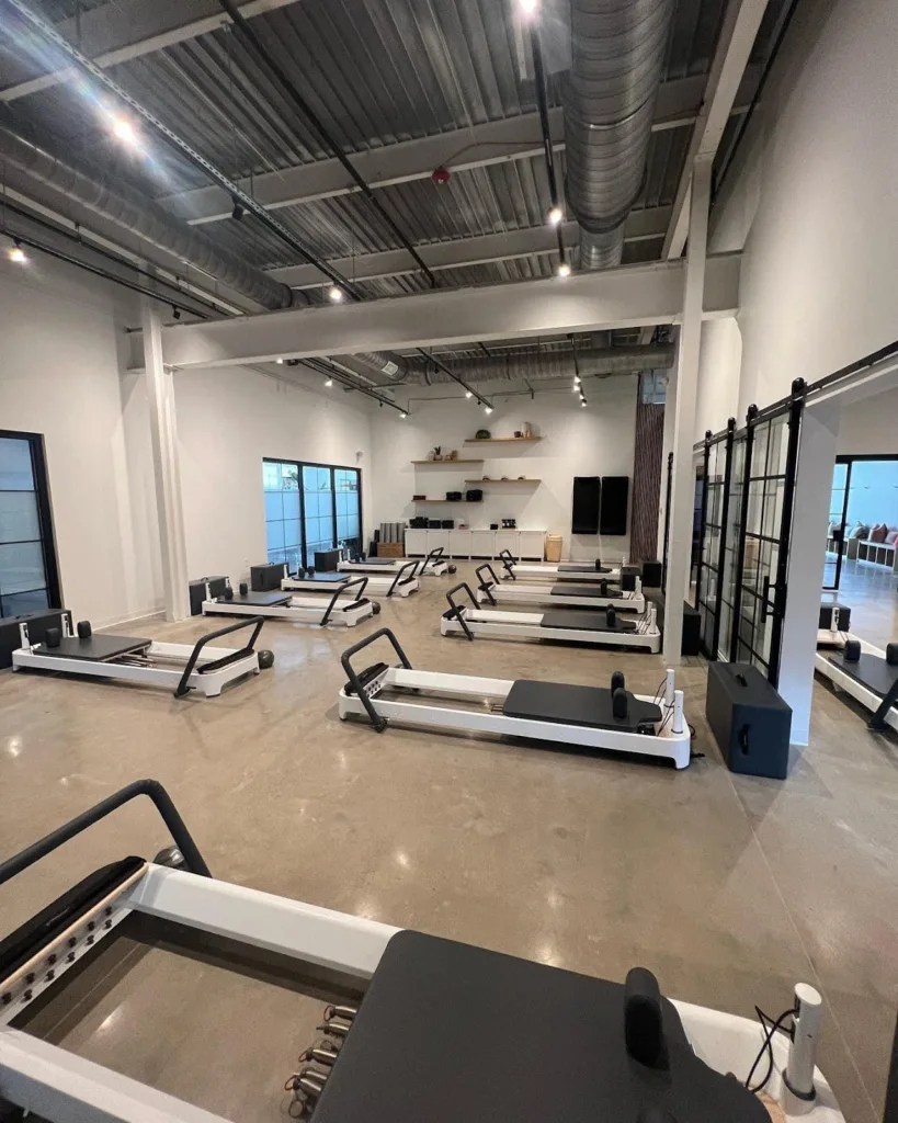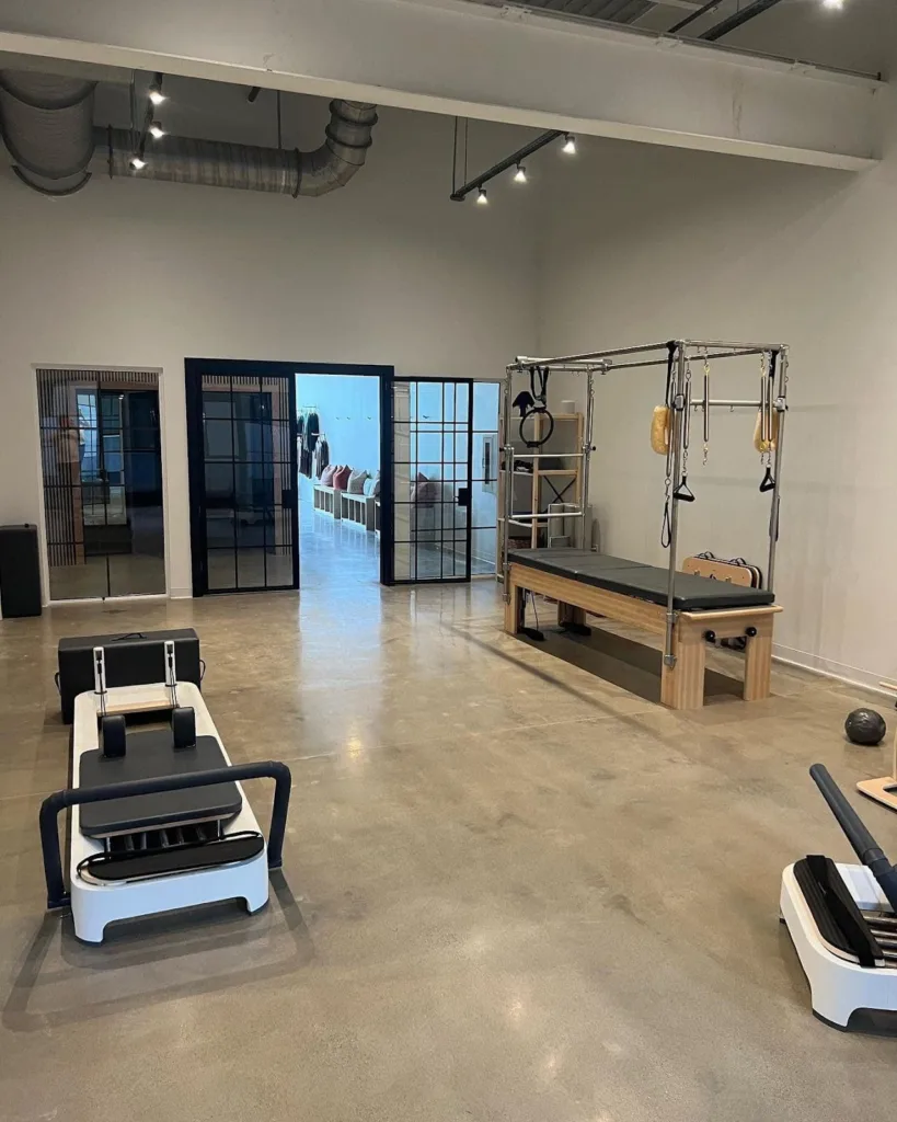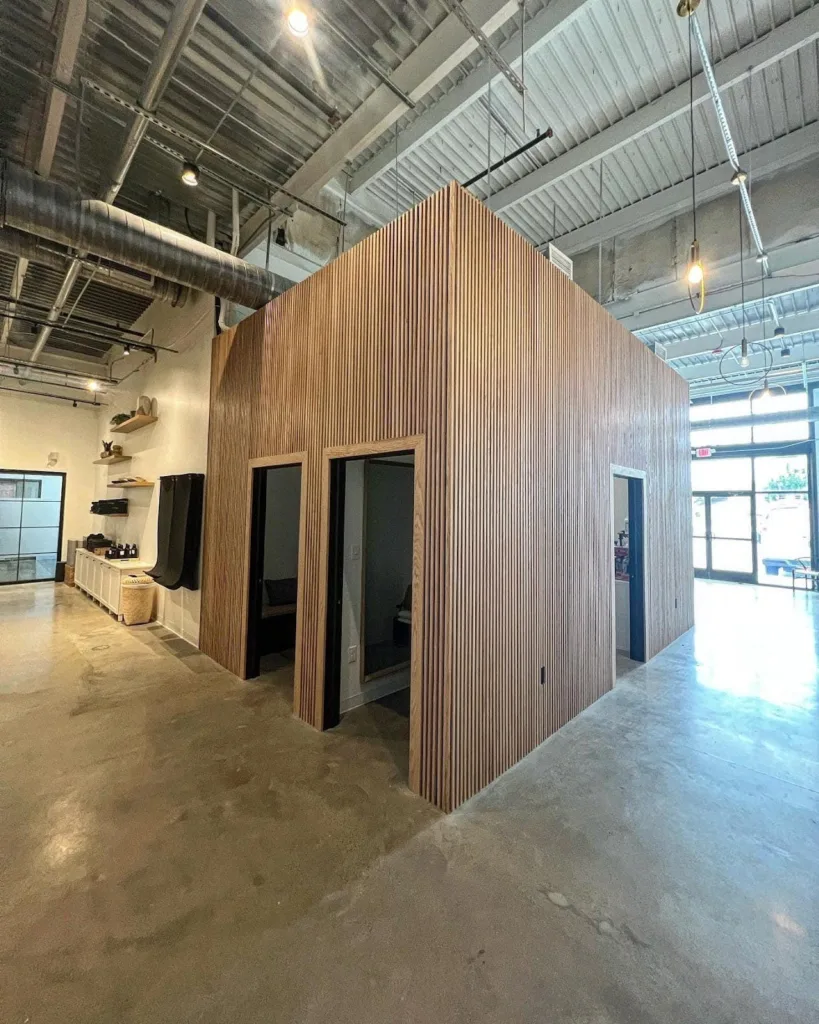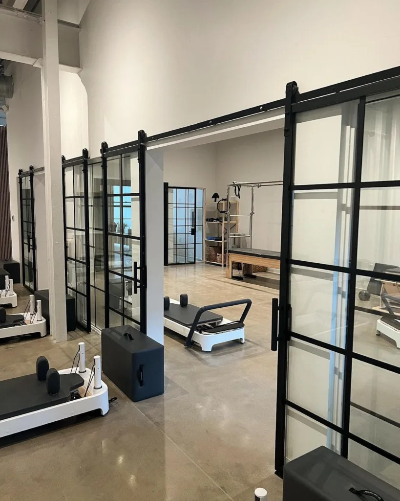 Studio Pilates @ Highland yards. Our commercial team recently completed this 2,000 Sq Ft Pilates studio build out. The industrial modern finishes feature an oak slat wall, lime wash feature wall, custom front desk, glass/steel French and barn doors and exposed ceilings.